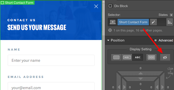 This one is very easy :) you just need to select the element you want to hide and then change its Display Setting to Display none.